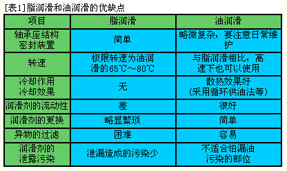軸承的潤(rùn)滑方法,大致可分為脂潤(rùn)滑和油潤(rùn)滑。為了充分發(fā)揮軸承的性能,根據(jù)使用條件和使用目的,選擇適當(dāng)?shù)臐?rùn)滑方式十分重要。[表1]列出了脂潤(rùn)滑和油潤(rùn)滑的優(yōu)缺點(diǎn)。